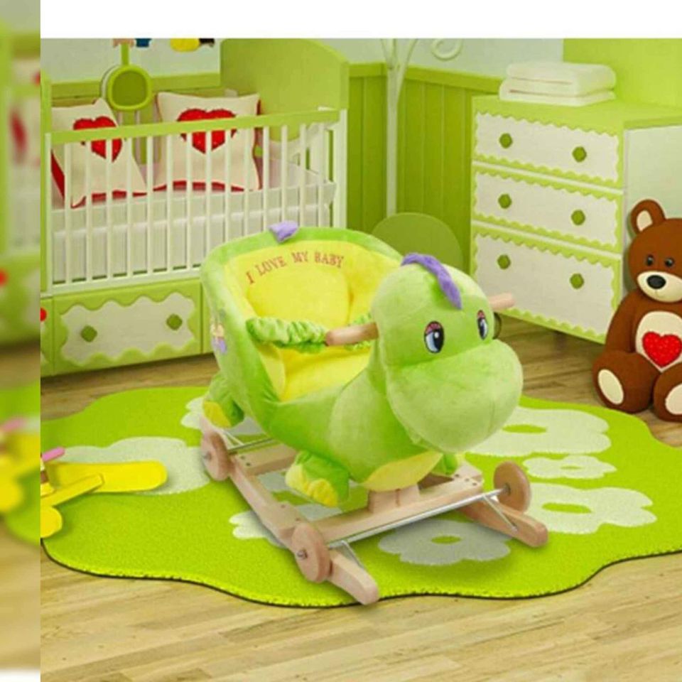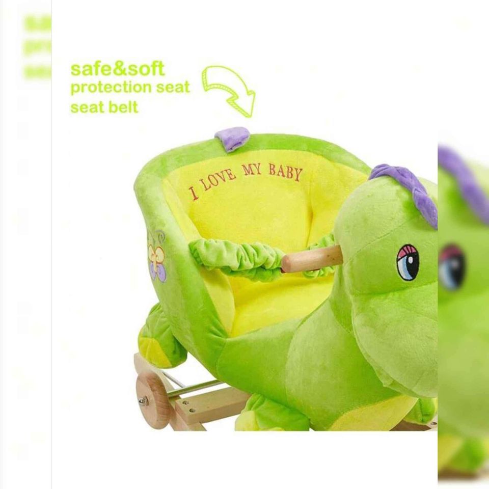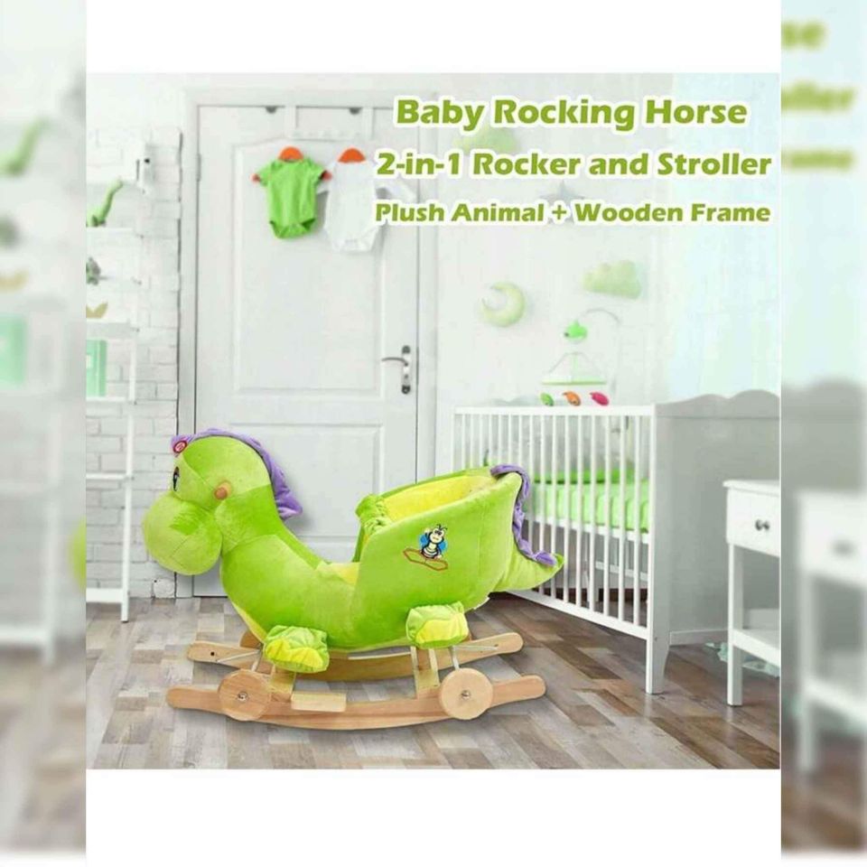- Rocking Horse, Rocker can convert into a stroller without tools, easy and space-saving. Wheels can run on floors or lawn. * The supporting structure is made of solid wood and covered with a soft plush cover. It is specifically cute and sturdy. * Every kid will be pleasantly surprised and happy to have such a gift. * The Rocking horse has handles, a tall seat back, and a seat belt, parents can put small children on the Rocking horse and they will be surrounded by the 360° protection. (Parents should still be available while children use this rocker) * For early age babies, exploring new things by themselves helps develop their independent play and curiosity. Each model of our Rocking horse with Dinosaur shape help children to perception and exploring. * It also have a sound models available hidden on the head, let your baby find it out! * Perfect for kids 1-3 years. Specifications